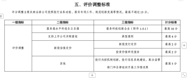 评价调整板块(最高15分)成为此次修订的亮点,通过新增和优化指标,引导投行聚焦服务国家战略,强化功能发挥。其中,服务高水平科技自立自强指标进一步细化,新增两项判定标准。