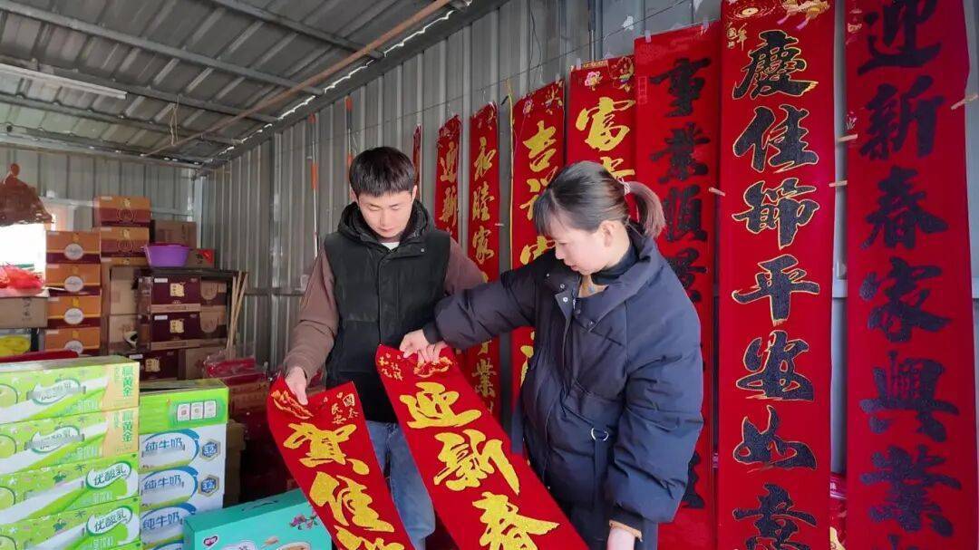 王兆坤和妻子魏旭正在挑选春联。他手指轻轻抚过“福”字的凸起纹路,转头向妻子比画着,脸上露出满意的笑容。