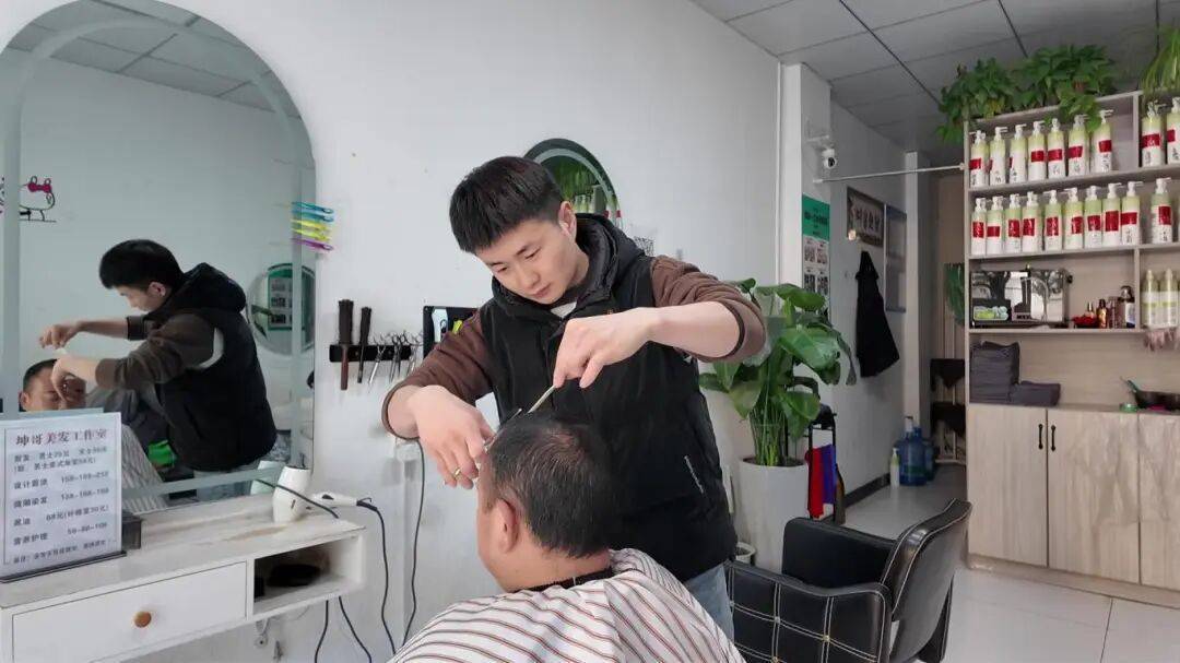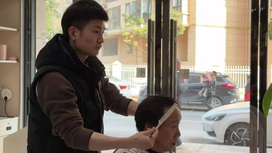 顾客何新富基本每个月都来这家店理发。“这孩子做事比较细心,每次理好了再洗一遍,然后吹干,连头发茬子都给我清理得干干净净。”何新富说。